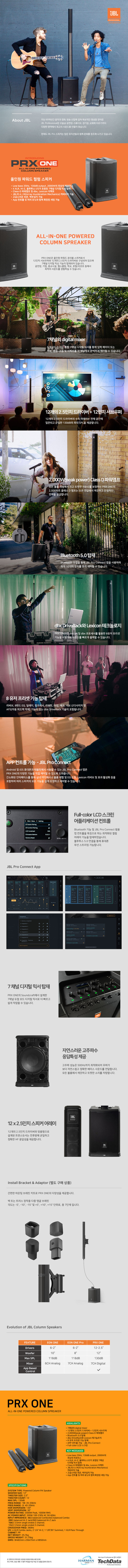 JBL PRX ONE 올인원 파워 컬럼 PA는 7채널 디지털 믹서, 전문 DSP 전체 제품군, 동급 최고의 오디오 연결, Bluetooth 기능 및 JBL Pro Connect 범용 앱 제어 기능을 갖춘 음향학적으로 최적화된 컬럼 어레이를 갖추고 있습니다.